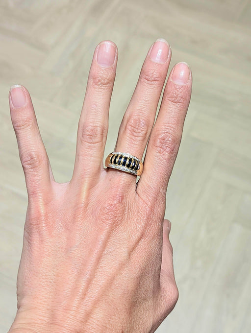 Eleganter Ring in Form eines Bandes, besetzt mit Diamanten und 7 Reihen kleiner kalibrierter Saphire, aus 750/1000 Gold.