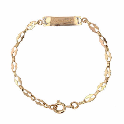 - Hübsches altes Kinderarmband, bestehend aus gezackten und ovalen Gliedern mit einer kleinen Plakette aus Gelbgold, in die der Vorname Maryvonne eingraviert ist und die mit mehrlappigen Motiven aus Weißgold eingefasst ist. Der Verschluss ist ein Federring.
