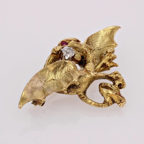 - Prächtige antike Brosche, sie stellt eine Chimäre mit ausgebreiteten Flügeln dar. Das Wesen hat sein Maul geöffnet und hält zwischen seinen Reißzähnen einen alten Diamanten im Brillantschliff, sein Auge ist ein kleiner Rubin. Der Verschluss ist ein Stift mit Sicherheitshaken, der sich auf der Rückseite befindet und ebenfalls gemeißelt ist.