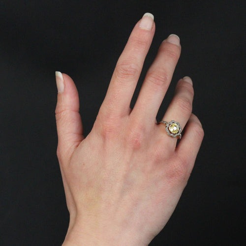 - Die Fassung dieses femininen antiken Rings stellt eine Blume dar, deren Herz mit einem natürlichen gelben Saphir geschmückt ist, der in einer geschlossenen Fassung in einer polylobigen Umgebung gehalten wird, die mit Diamanten im Rosenschliff verziert ist, die die Blütenblätter einer Blume stilisieren. Der Korb ist durchbrochen gearbeitet und der Ringanfang ist auf beiden Seiten mit 2x3 Diamanten im Rosenschliff verziert.