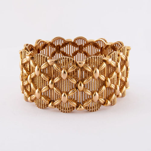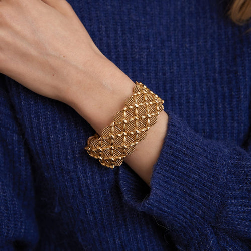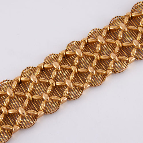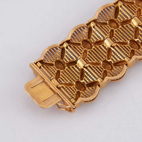 - Bedeutendes Bandarmband aus 18-karätigem (750 Tausendstel) Gelbgold, bestehend aus gegliederten, durchbrochenen und kugelförmigen Plättchen mit kreuzförmigen Motiven.