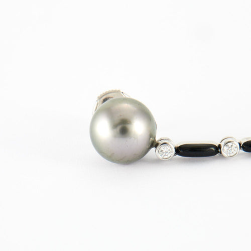 - Paar bewegliche Ohrringe aus 750°/°°-18-karätigem Weißgold, besetzt mit einer Reihe von Diamanten im Brillantschliff, ca. 0,50 Karat, schwarzer Lack, 2 graue Tahiti-Perlen mit einem Durchmesser von 10,3 mm und 2 birnenförmige Goldperlen von Australien mit den Maßen 14 x 10,8).