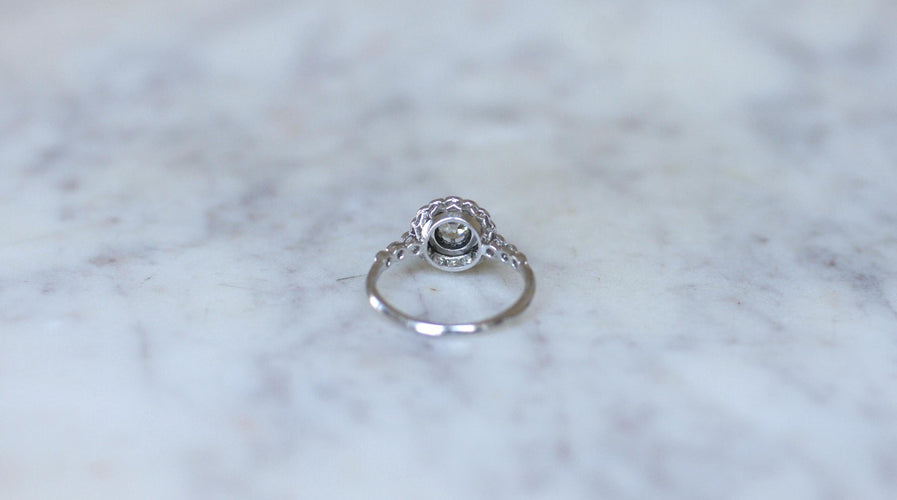 Zarter Gänseblümchenring aus Platin (Punzenzeichen: Hundekopf), in dessen Mitte ein Diamant im Altschliff mit einem Gewicht von ca. 0,25 ct (geschätzte Farbe I, geschätzte Reinheit VS) in einer Umgebung aus 8x8 geschliffenen Diamanten sitzt, deren Gesamtgewicht auf ca. 0,40 ct geschätzt wird.