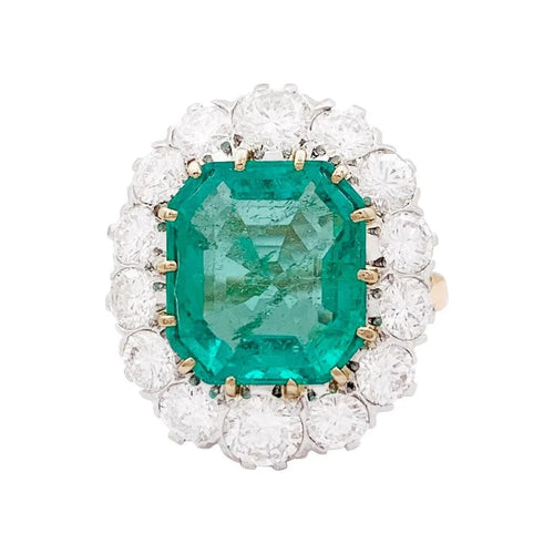 Zweifarbiger Goldring aus 18 Karat (750/°°°), mit einem kolumbianischen Smaragd in der Mitte, vermutlich leichte Ölimprägnierung, Gewicht ungefähr 4,16 Karat; Diamantumrandung für ca. 1,70 Karat Diamanten.