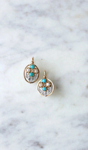 Alte Schlafohrringe aus 18-karätigem Roségold (Adlerkopfpunze), verziert mit Türkis, feinen Perlen und Diamanten im Rosenschliff.