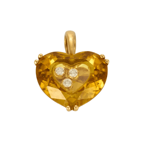 Anhänger aus 18 Karat (750 Tausendstel) Gelbgold, verziert mit einem facettierten Citrin in Krappenfassung, der ein Herz bildet, das wiederum mit drei beweglichen Diamanten in geschlossener Fassung mit einem Gesamtgewicht von ca. 0,30 Karat verziert ist und von einem Saphirglas gehalten wird. Unterschrift " Chopard „Lasergravur auf dem Glas. Signiert“ Chopard " und auf der Kaution nummeriert.