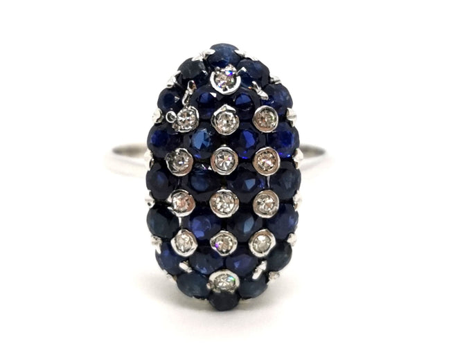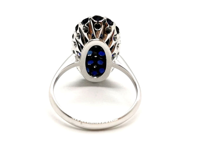 Sortija con zafiros y diamantes, en oro blanco de 750 milésimas (18 quilates), compuesta de un fino anillo liso de oro blanco y de un aro calado en los laterales, enteramente engastado en garras, con 26 zafiros brillantes de aproximadamente 0,075 ct cada uno, en total peso de los zafiros: aproximadamente 1,95 ct y 14 diamantes talla brillante, aproximadamente H/VS, engastados en bisel, de aproximadamente 0,01 ct cada uno, peso total de los diamantes: aproximadamente 0,14 ct, Talla de anillo: 57, dimensiones del patrón en la parte superior: 1,98 cm x 1,15 cm, peso total: 5,29 g, engaste ligeramente dañado, búho contrastado, buen estado.