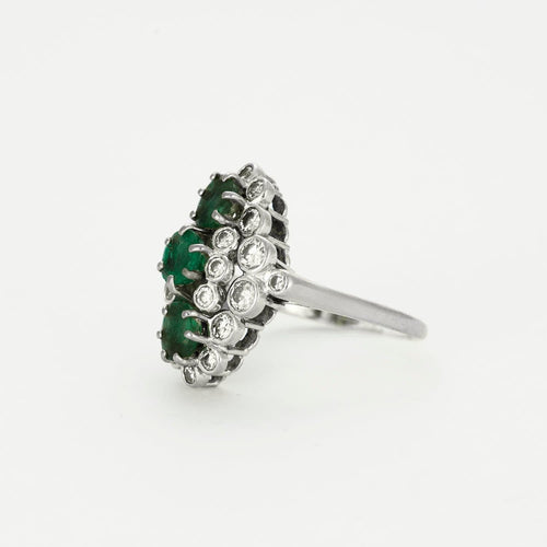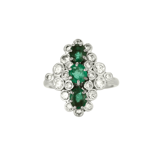 Sortija “Marquise” de oro blanco de 18 quilates (750 milésimas), centrada en tres esmeraldas facetadas, redondas y ovaladas, engastadas en garras realzadas con pequeños diamantes talla brillante, algunos de mayor tamaño, con un peso aproximado de 0,05 quilates cada uno, engaste cerrado. Marca de título francesa. Talla de anillo: 55.