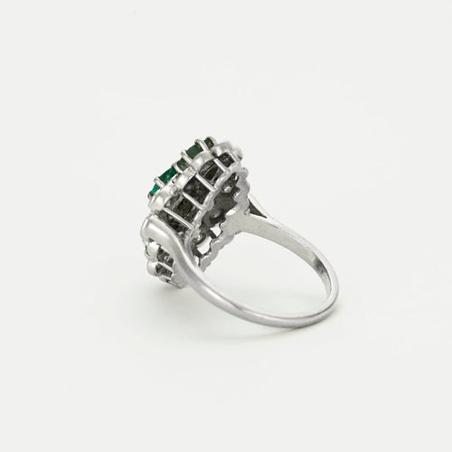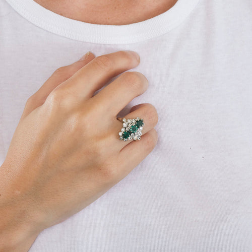 Anillo marquesa de oro blanco con esmeraldas y diamantes