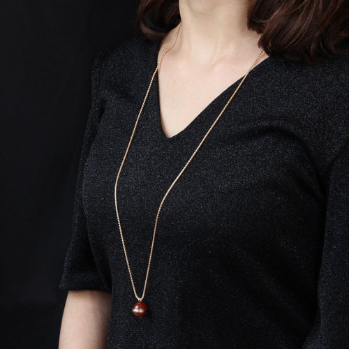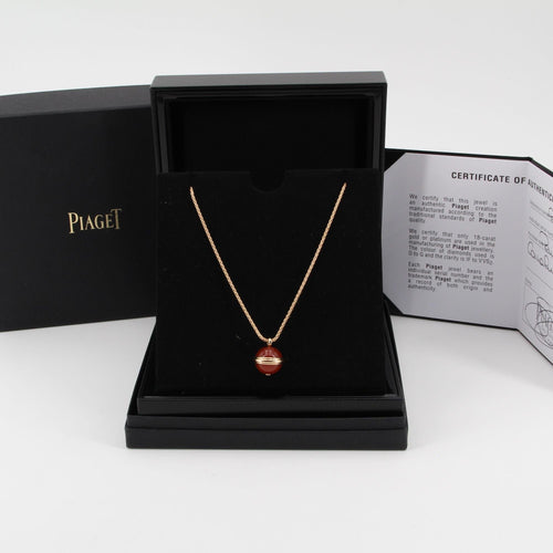 - Collar Piaget de segunda mano de la colección "Possession", está formada por una larga cadena que sujeta un colgante formado por 2 cabujones de cornalina y un disco giratorio decorado con un moderno diamante talla brillante. El cierre de la cadena es de mosquetón y presenta una borla decorada con la letra “P ". El collar Piaget Se puede llevar en fila simple o doble o un poco más corto con el anillo intermedio.