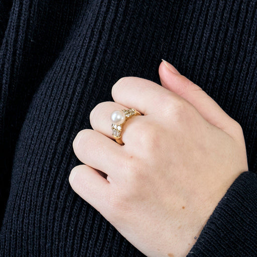 Elegante anillo de oro amarillo de 18 quilates (750/°°°) centrado con una perla cultivada blanca (de aproximadamente 6,5 mm de diámetro) en un hombro de diamantes de talla brillante y talla trapezoidal de aproximadamente 0,45 ct (estimado GH/VS-SI).