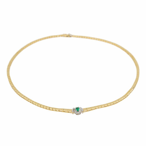 Collar de oro amarillo de 750 milésimas (18 quilates), engastado con una esmeralda y diamantes, malla fantasía, una esmeralda ovalada de aproximadamente 0,21 ct, rodeada de 10 diamantes talla brillante aproximadamente G-SI, peso total de los diamantes: 0,20 ct (cada diamante pesa aproximadamente 0,02 ct), largo del collar: 45,00 cm, largo de la pieza incluyendo los motivos: 1,03 cm, ancho: 0,93 cm, peso total: 22,21 g, distintivo búho, excelente estado
