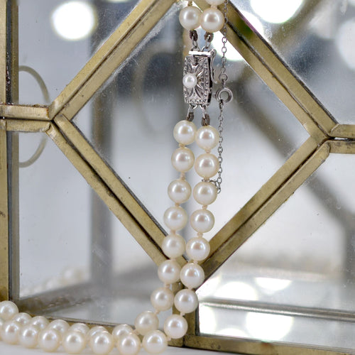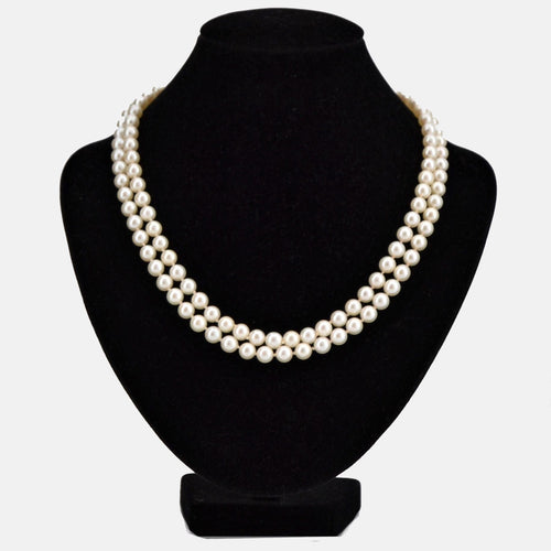- Collar gargantilla, está formado por una doble hilera de perlas cultivadas redondas, de color blanco nacarado oriental. El cierre en plata Es trinquete con cadena de seguridad y seguridad "8". Está cincelada y decorada en su parte superior con una pequeña perla cultivada.