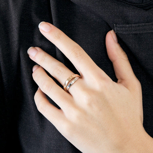 Sortija en oro rosa de 18 quilates (750 milésimas) y oro blanco formando dos anillos entrelazados engastados con 6 pequeños diamantes con un peso total aproximado de 0,07 quilates. Firmado "Cartier" y numerado dentro del anillo rosa. Marca del fabricante de la casa y título suizo (Saint-Bernard).