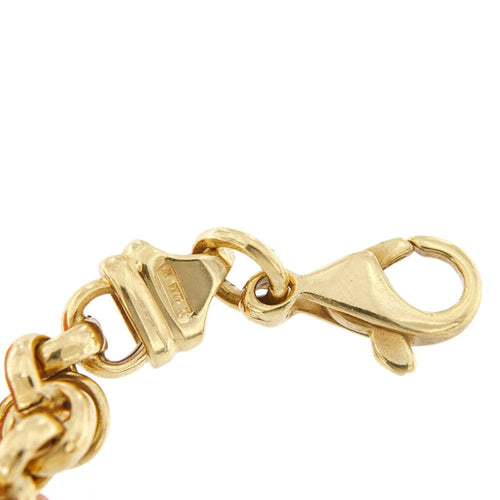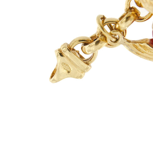 Bracciale maglia rolò de oro de 18 kt con dijes de temática marina: pez, polipi, estrella marina, granchi, coralli, perla y turchesi.