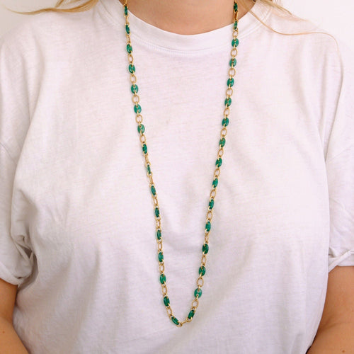 - Collar largo firmado por la Casa Boucheron en oro amarillo de 18k (750 milésimas) compuesto por 41 elementos de crisoprasa alternados con eslabones de oro amarillo.