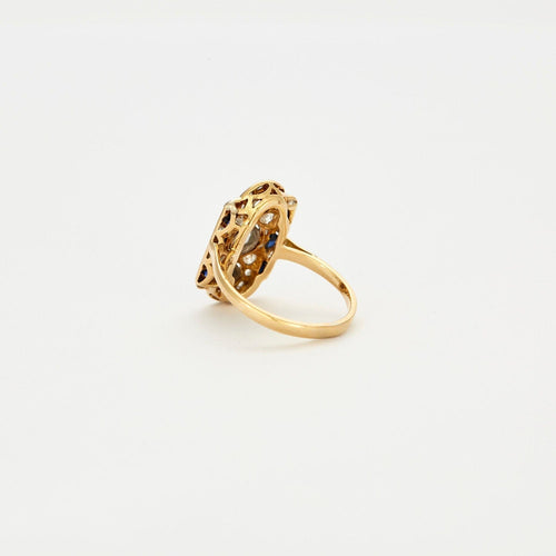 Anillo Art Deco oro amarillo y blanco, diamantes y zafiros