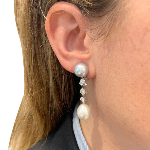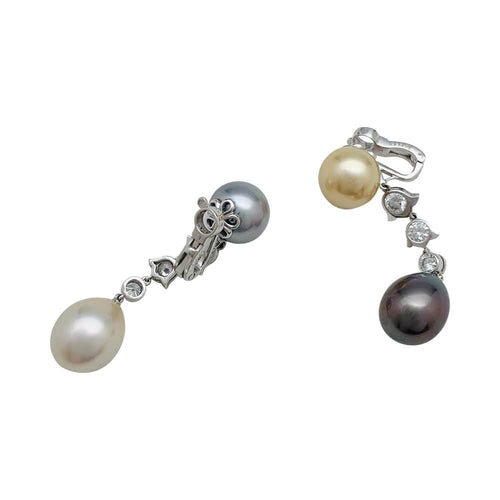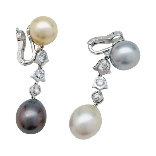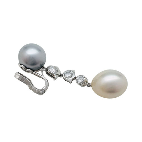 Un par de pendientes firmados por la Casa Cartier, modelo “Agnès”, en oro blanco 750/000 y platino 950/000, asimétrico, realzado con diamantes talla brillante y perlas cultivadas de los Mares del Sur en oro, crema y grises. También vendemos el collar a juego.