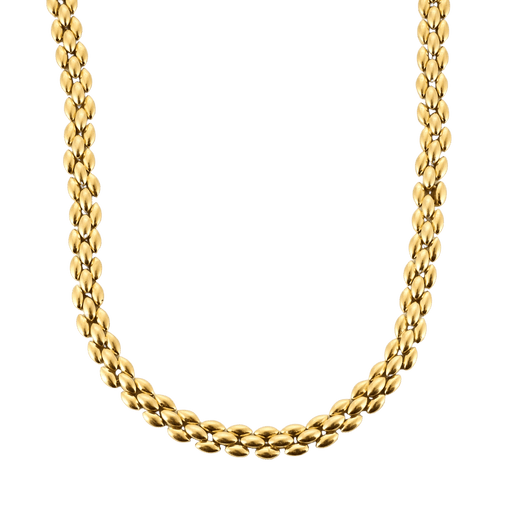 Collar en oro amarillo de 18 quilates (750 milésimas) eslabón grano de arroz con cierre de trinquete. Marca de título francesa (cabeza de águila).