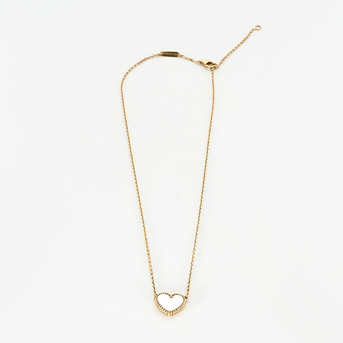 Collar de oro amarillo de 18 quilates (750 milésimas) compuesto por una pequeña cadena eslabón preso sosteniendo un colgante de nácar con motivo de corazón, engastado con cuentas. El collar es ajustable en longitud y equipado con un cierre de resorte.