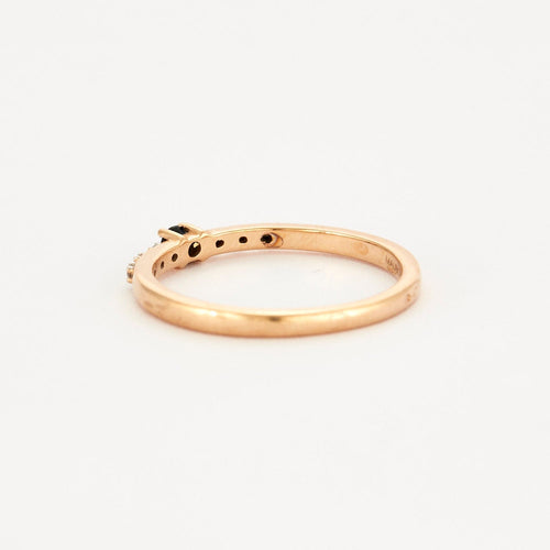 Anillo en oro amarillo de 18 quilates (750 milésimas) centrado con un zafiro facetado de talla redonda de aproximadamente 0,05 quilates, engastado en garras y sostenido por 6 diamantes talla brillante de aproximadamente 0,01 quilates cada uno, engastados en garras. Anillo firmado y numerado por la casa.