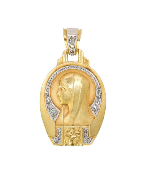 Medalla religiosa Art Déco Virgen De perfil, oro amarillo con diamantes talla rosa