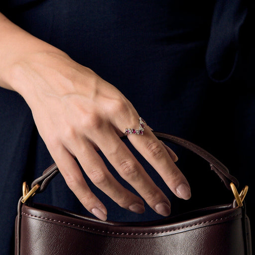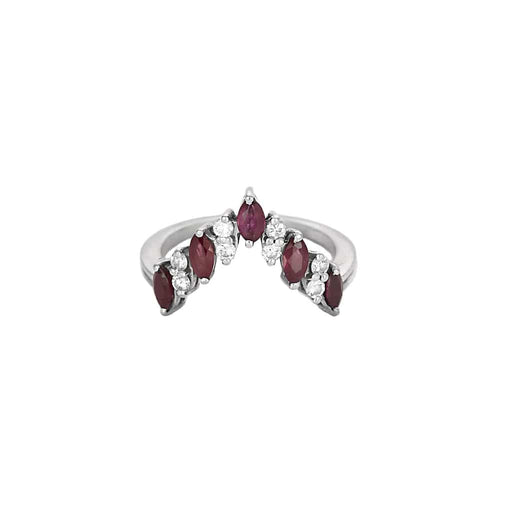 Valkokultainen sormus, jossa on rubiineja ja timantteja