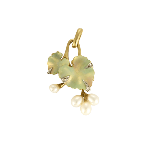 Pendente in oro giallo e platino con motivo di foglie, rose diamantate e perle di coltura bianche