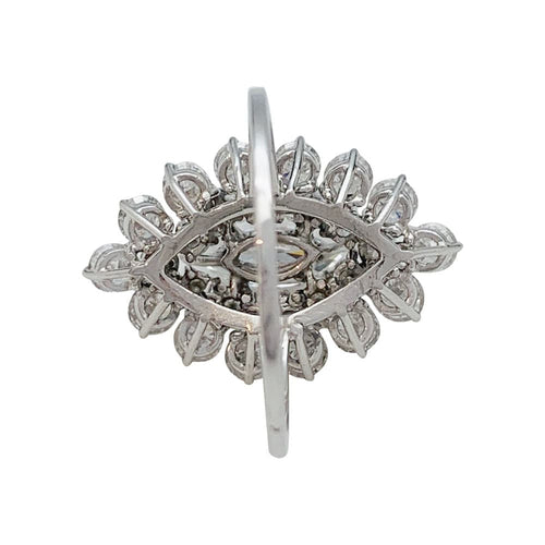 Un anello dentro platino 950/000 incentrato su un diamante taglio navetta da 1,29 carati, colore F, purezza VVS2 in una doppia cornice di diamanti taglio brillante per un totale di circa 2,5 carati.