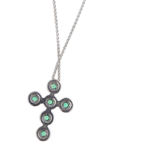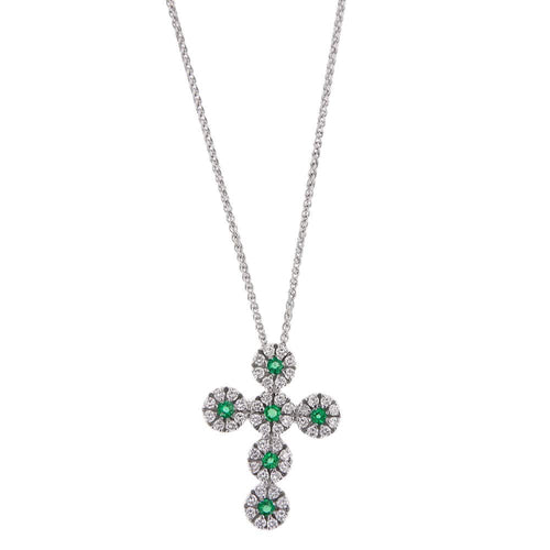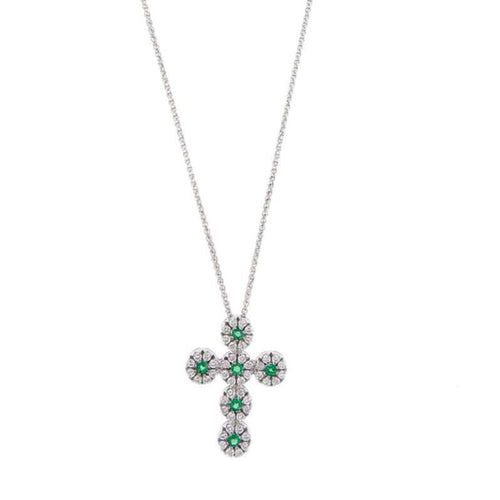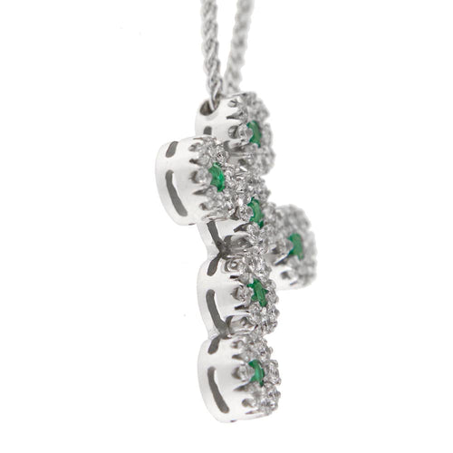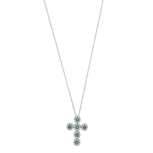 Collana a maglie a punta in oro bianco 18 kt con pendente a forma di croce composta da 6 cerchi con 48 diamanti taglio brillante da 0,01 ct ciascuno. totale 0,48 ct - colore FG VS purezza e 6 smeraldi da 0,03 ct ciascuno. totale 0,18 ct.