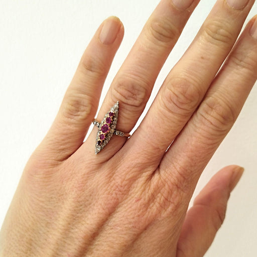 Questo anello Marchesa è incastonato con cinque rubini su una linea centrale, incorniciati da una linea di 26 diamanti di taglio vecchio. L'anello è ornato con due diamanti a taglio antico su entrambi i lati del motivo principale.