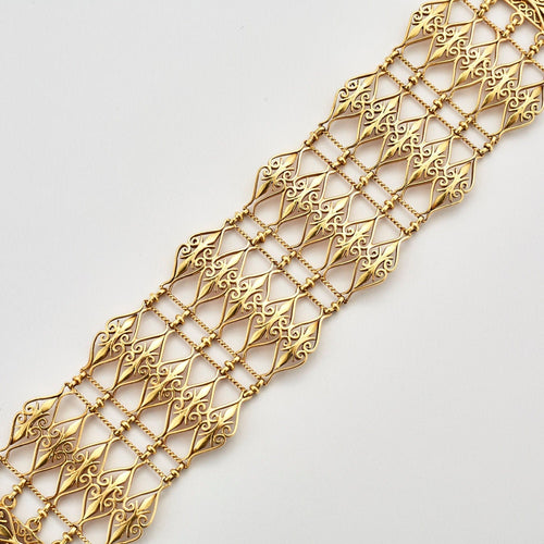 Polsino con decorazione traforata e tortile, composto da cinque file di maglie olivastre con lavorazione in filigrana.