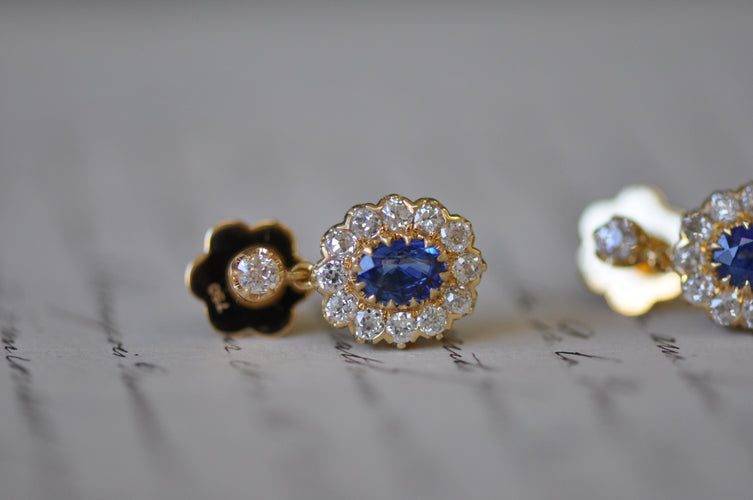 Orecchini vittoriani in zaffiro blu, presentano 2 zaffiri centrali naturali del peso di circa 1,58 carati. Intorno agli zaffiri è incastonato un grappolo di diamanti a taglio vecchia miniera, per un peso totale del diamante di circa 1,45 carati. Questi orecchini sono antichi vittoriani del 1900 circa e realizzati in oro giallo 18 carati e vengono forniti con un nuovo retro.