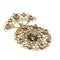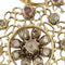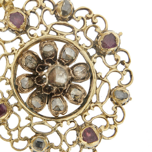 Antico pendente rotondo in oro giallo 18kt con corona a cerniera ornata da diamanti e rubini taglio vecchio. Fiore con 9 diamanti taglio rosetta: 1 diamante centrale da 0,20 ct e 8 petali da 0,05 ct ciascuno. traforato attorno a 4 diamanti taglio tavola da 0,05 ct ciascuno. e 4 rubini da 0,10 ct. La parte superiore con 3 rubini da 0,10 ct ciascuno. e 2 diamanti taglio tavolo da 0,05 ct ciascuno. totale: diamanti 0,90 ct e rubini 0,70 ct.
