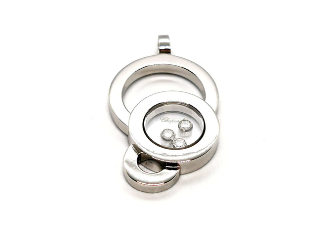 Ciondolo firmato dalla casa Chopard, collezione Happy Diamonds, forma rotonda, in oro bianco da 750 millesimi (18 carati), tra 2 cristalli di zaffiro, 3 diamanti mobili taglio brillante da circa 0,03 ct ciascuno, peso totale diamanti circa 0,09 ct, circa E/VVS, dimensioni: 3,57 cm