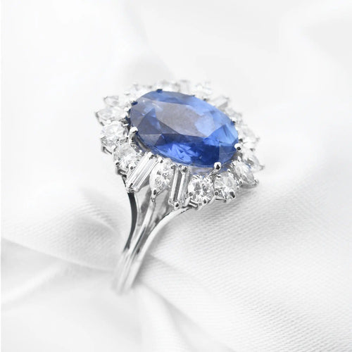 Esclusivo anello in oro bianco 18 carati, con punzone zaffiro naturale da 5,37 carati proveniente dalla Birmania, senza calore.