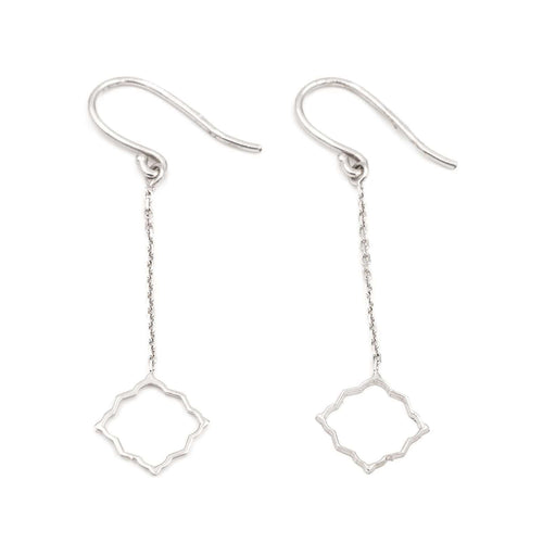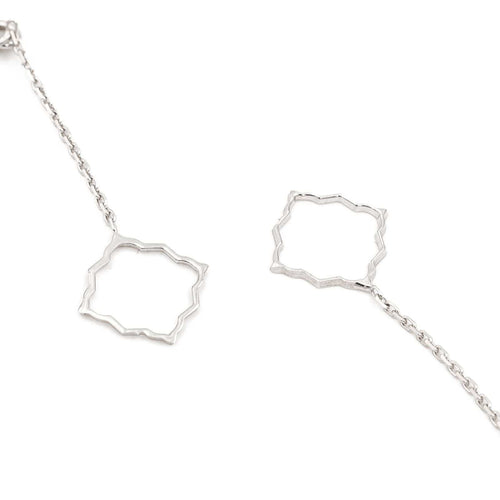 Orecchini pendenti in oro bianco 750 millesimi (18 carati), motivo grafico trasparente sospeso ad una catena a maglia carcerata, dimensioni del motivo: 1 cm x 1 cm, larghezza della catena: 0,7 mm, lunghezza totale: 3,7 cm, totale peso gr 0,85, punzone testa d'aquila, nuovo