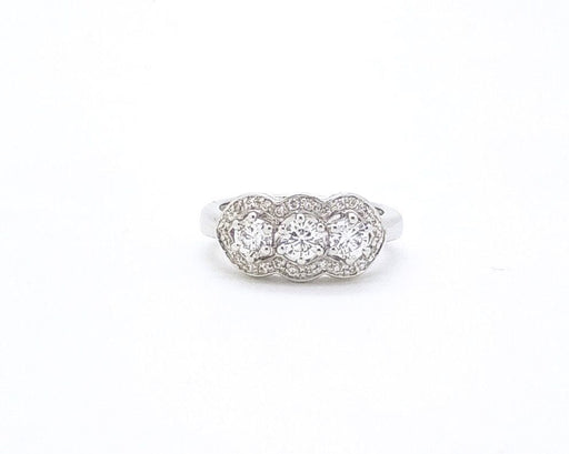 Anello trilogy in oro bianco CT 750 peso gr. 6. Tre diamanti centrali CT 0,75 e pavimentazione di diamanti CT 0,16. Colore diamanti F e purezza IF. Con certificato.