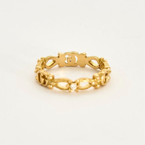 Fede nuziale in oro giallo 18 carati (750 millesimi) finemente cesellata e traforata, scandita da motivi floreali ornata da piccoli diamanti taglio brillante del peso di circa 0,02 carati ciascuno. Firmato Gucci. Segni distintivi italiani.