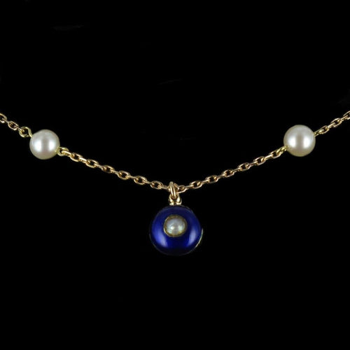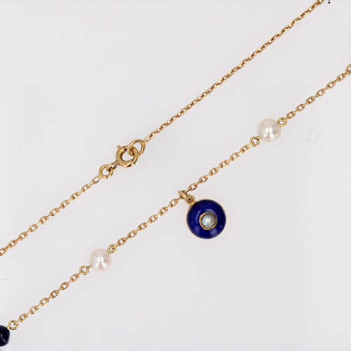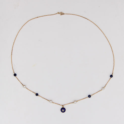 Collana in oro giallo 750/1000, 18 carati, punzone testa d'aquila. Realizzato in maglia galeotta, è decorato sul davanti con 4 perle di lapislazzuli e 4 perle coltivate orientali bianche alternate. Il motivo centrale è una semisfera in smalto blu con incastonata una raffinata semiperla.
