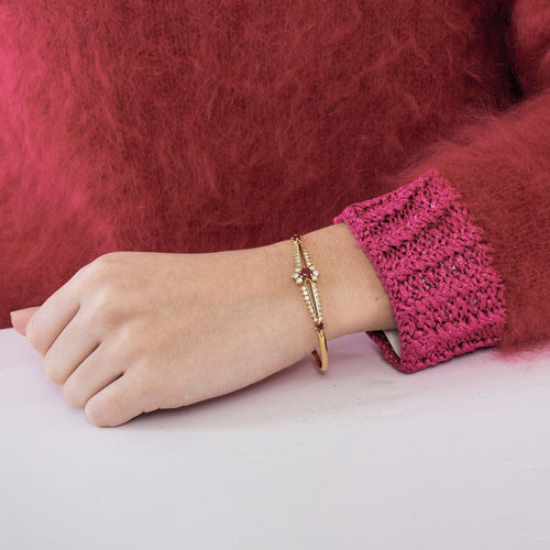 Magnifico bracciale in oro giallo 750/1000, modello bangle semi-rotondo a due articolazioni, che forma sul davanti un motivo a forma di diamante incastonato al centro con un rubino taglio ovale da 0,55 carati, coronato sui due poli con 6 diamanti taglio brillante del peso complessivo di circa 0,5 carati, poi sorretto da due rami su ciascuno di una linea composta da 32 diamanti taglio brillante del peso complessivo di circa 1,1 carati per essere infine incastonato con un rubino taglio rotondo a ciascuna estremità del peso complessivo di 0,5 carati.