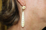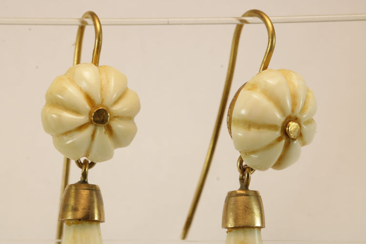 Il piqué è l'antica (e perduta!) arte di intarsiare piccoli punti d'oro sul guscio di tartaruga o sull'avorio. Quest'arte ebbe inizio a Napoli nel XVIII secolo. Qui abbiamo un delizioso paio antico di orecchini in avorio con una goccia piatta molto lunga piena di piccoli punti dorati, anch'essi in oro bicolore. Un'incredibile opera perfetta della fine del XIX secolo che raggiunge uno stile molto elegante e dettagliato. Il Piano è un elemento circolare intagliato.