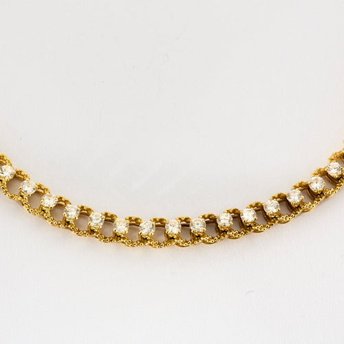 Elegante collana in oro giallo 18 carati (750/°°°) con maglia texturizzata, caratterizzata al centro della chiusura e nella parte anteriore da una fila di diamanti taglio brillante per circa 3,30 carati (stima H/VS-SI).