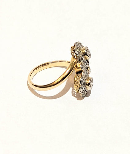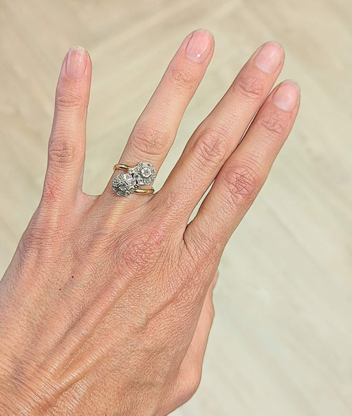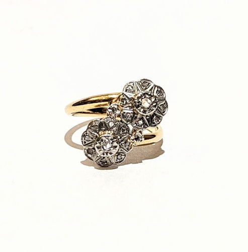 Grazioso anello Art Nouveau in 2 oro 750/1000e che presenta due fiori in te e me incastonati con piccoli diamanti con taglio a rosa.