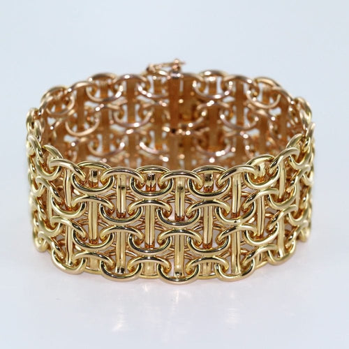 Il suo design artistico combina perfettamente la solidità dell'oro e la leggerezza della maglia, creando così un gioiello eccezionale. Questo bracciale polsino è un accessorio versatile che può essere indossato tutti i giorni per aggiungere un tocco di lusso al tuo outfit o per completare un elegante look da sera.
