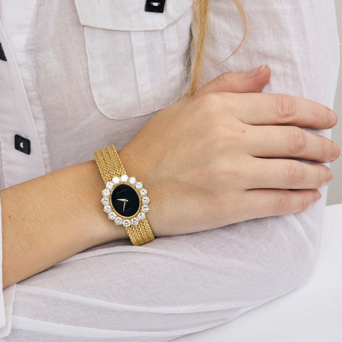 Questo orologio eccezionale con doppia firma Mauboussin e Vacheron Constantin unisce il know-how di due importanti case di alta orologeria e gioielleria. Realizzato in oro giallo 18 carati (750/°°°), presenta un elegante quadrante in onice circondato da diamanti per un totale di circa 4,2 carati (stimato F/VVS), che rendono questo orologio un gioiello unico. Movimento meccanico, carica nascosta.