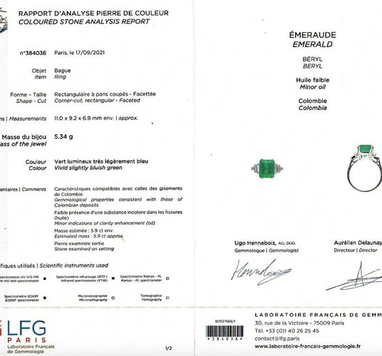 Certificato del Laboratorio Gemmologico Francese (LFG): origine colombiana.