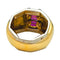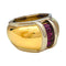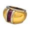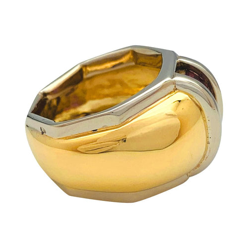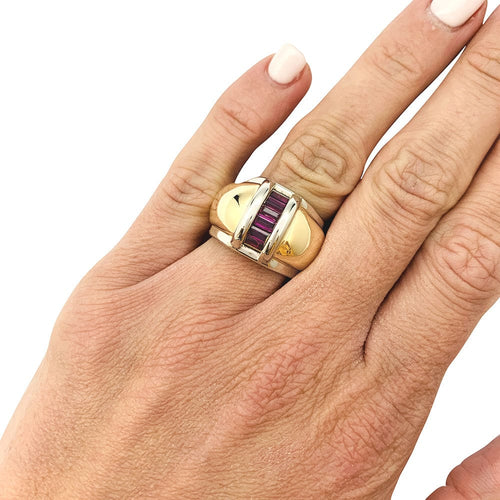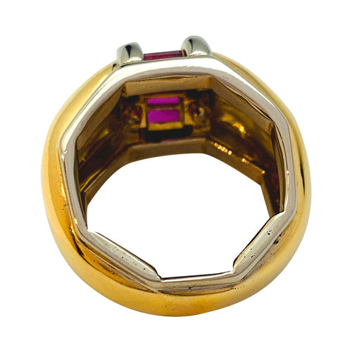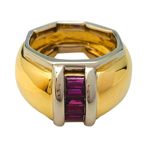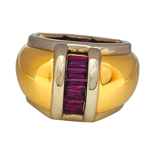 Un anello firmato dalla Maison Poiray in oro giallo e bianco 750/000 caratterizzato da un grande anello bombato decorato con rubini calibrati.