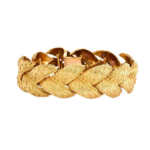 Elegante bracciale in oro giallo 18K (750 millesimi) articolato con maglie stilizzate a "foglia" finemente cesellate. È dotato di una chiusura a cricchetto con otto fermagli di sicurezza.