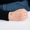 Bracciale in oro rosa 18K (750 millesimi) composto da un raffinato Maglia raffigurante un detenuto al centro, con un motivo rosa traforato incastonato con un piccolo diamante taglio brillante del peso di circa 0,05 carati in una montatura chiusa. È decorato con una chiusura a molla, lunghezza regolabile.